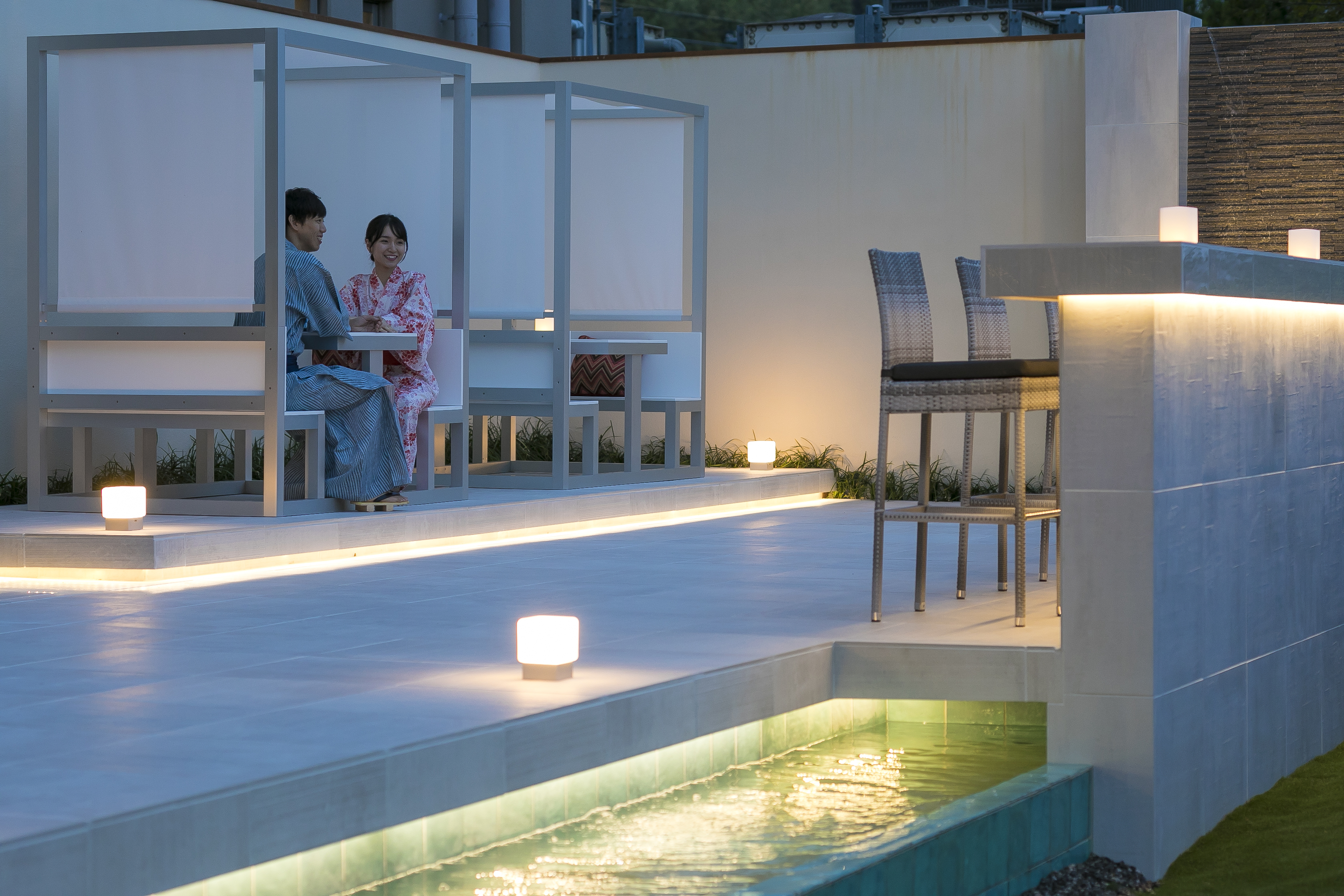流れる水と光に囲まれたリゾート感